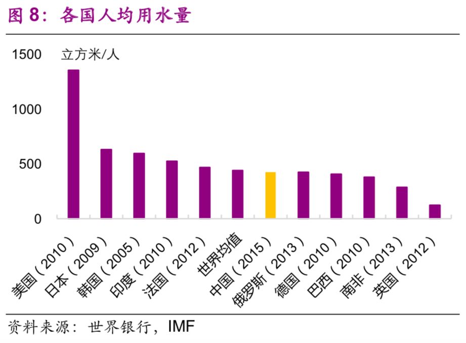 在用電與用水方面,中國的人均水平仍然較低,與人均GDP水平相適應。中國人均用電量和人均用水量分別為3927千瓦時(shí)/人(2014年數據)、425立方米/人(2015年數據),與世界平均水平(3966千瓦時(shí)/人、442立方米/人)大致相近,也與中國的人均GDP水平相適應,是美國(12984千瓦時(shí)/人、1357立方米/人)的30.2%、31.4%(圖7、8)。