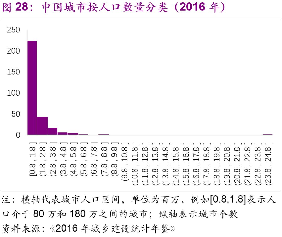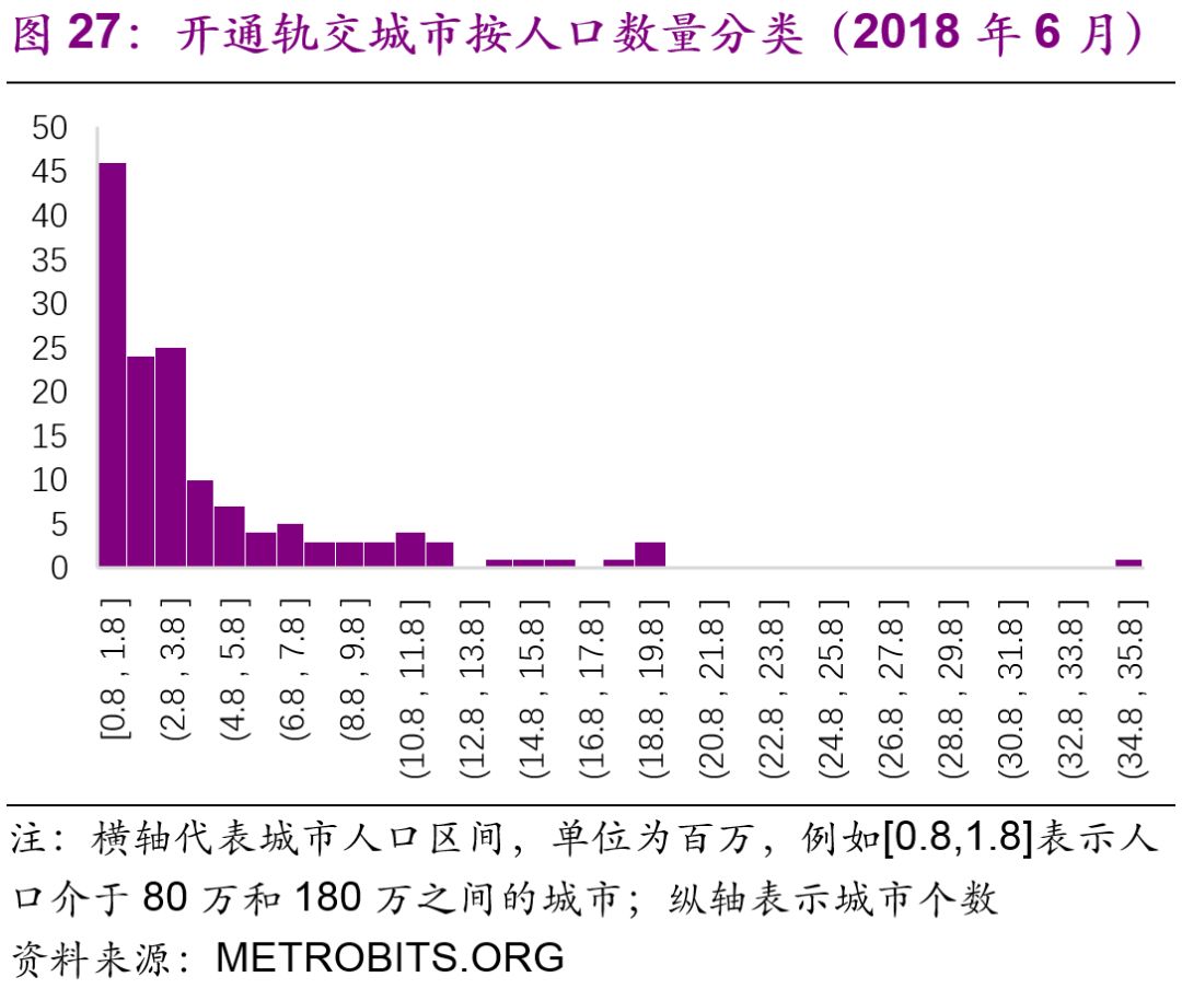 擬建地鐵、輕軌線(xiàn)路初期客運強度分別不低于每日每公里0.7萬(wàn)人次、0.4萬(wàn)人次,遠期客流規模分別達到單向高峰小時(shí)3萬(wàn)人次以上、1萬(wàn)人次以上。但是同時(shí)也強調了:“以上申報條件將根據經(jīng)濟社會(huì )發(fā)展情況按程序適時(shí)調整?!?016年,中國城市中市區常住人口在150萬(wàn)以上的城市共有111個(gè),對比目前已經(jīng)開(kāi)通軌道交通的城市數量(34個(gè)),仍有一定的發(fā)展空間。而從國際上看,建設軌道交通的城市人口的起點(diǎn)[19]大約為100萬(wàn)(圖27),如果長(cháng)期內中國將建設軌道交通的人口標準下調至100萬(wàn),那么將有225個(gè)城市符合標準(圖28)。