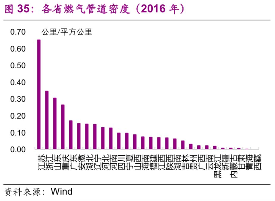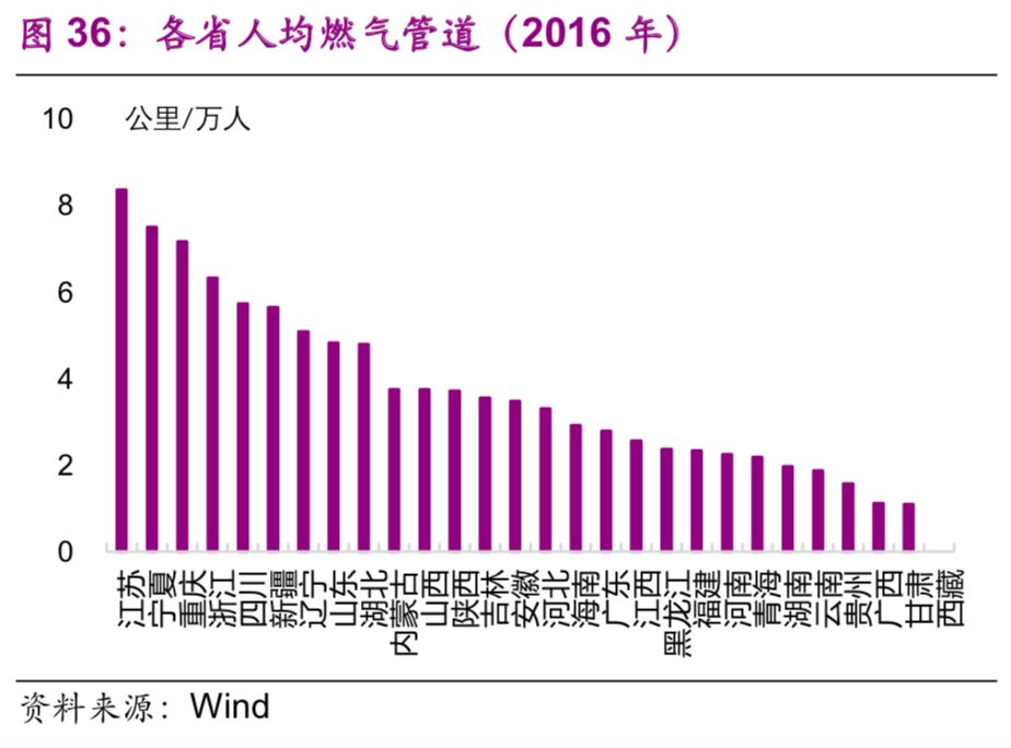 能源基礎設施方面,東部地區普遍高于中西部地區。2016年,燃氣管道密度排名前三的是江蘇(0.65公里/平方公里)、浙江(0.35公里/平方公里)、山東(0.31公里/平方公里)(圖35);人均燃氣管道[22]排名前三的也是浙江(8.4公里/萬(wàn)人)、寧夏(7.5公里/萬(wàn)人)、重慶(7.2公里/萬(wàn)人)(圖36)。
