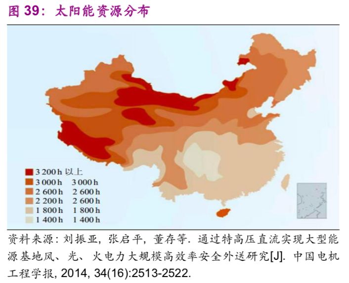 中國能源資源在地區之間的不平衡分布帶來(lái)了跨地區之間的能源輸送需求,例如“西電東送”“西氣東輸”。以水力資源為例,中國西部12個(gè)省的水力資源約占全國總量的81.46%,特別是西南地區的云、貴、川、渝、藏5個(gè)省占全國總量的66.70%。風(fēng)能、太陽(yáng)能同樣呈現西部多于東部的現象(圖38、39)。