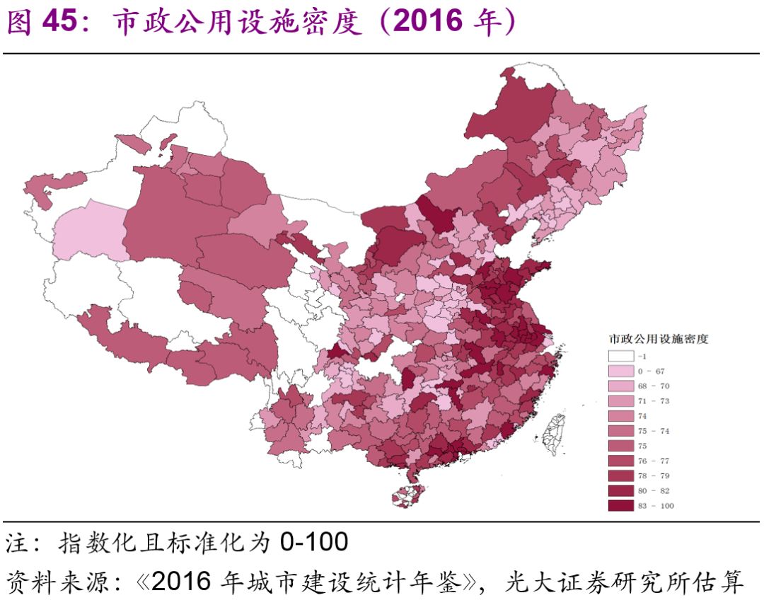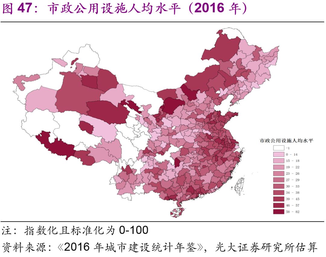 東部和部分西部城市的市政公用設施水平較高。為了綜合分析各個(gè)城市的市政公用設施水平,我們使用主成份分析法,選取人均日生活用水量、人均道路面積、人均公園綠地面積,對2016年中國各城市得出了綜合的城市市政公用設施的總量[27]、密度(圖45-46)和人均水平(圖47-48)進(jìn)行了比較。無(wú)論從總量、密度還是人均水平上來(lái)看,東部和部分西部城市都比較高,反而是一些中部和東北部城市的城市市政公用設施水平處于全國比較落后的狀態(tài)。