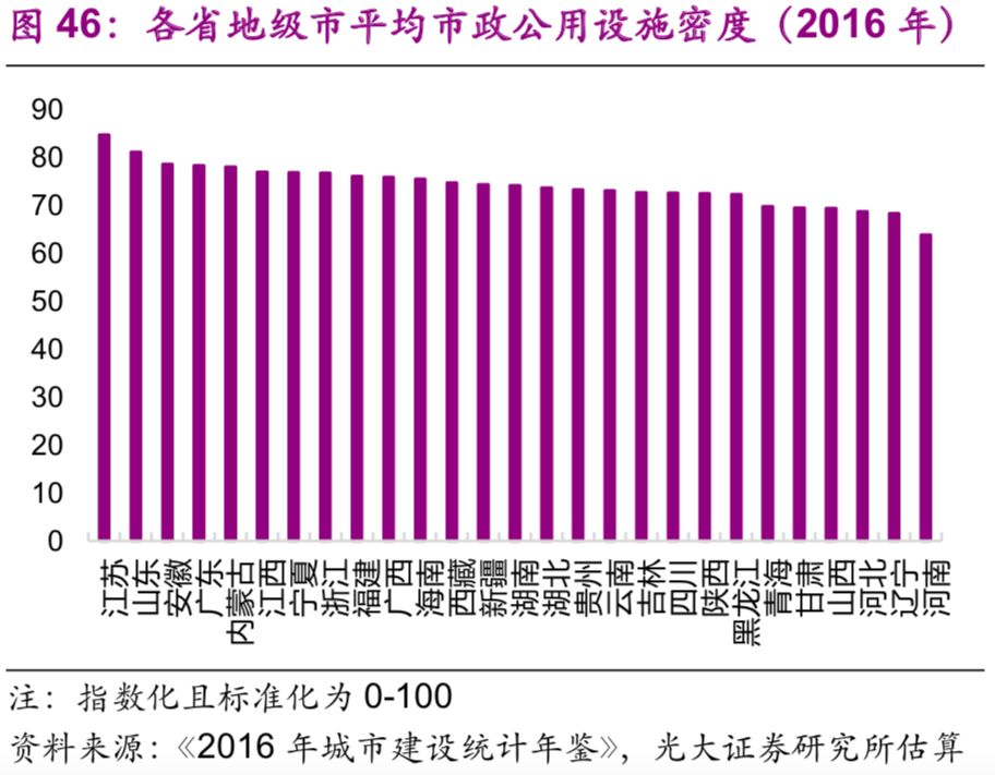 城市市政公用設施投資結構不斷變化。隨著(zhù)中國城鎮化的不斷推進(jìn),2016年投資額達1.7萬(wàn)億元的城市市政公用設施投資結構有了較大變化:1990年占據較大比重的燃氣(16%)、供水(20%)隨著(zhù)滲透率觸及“天花板[26]”后比重下降較快,兩者2016年的比重分別為2%、3%;而更能體現城市功能升級的公共交通、道路橋梁等的比重上升較快,1990年兩者的比重分別為8%、26%,2016年則分別為23%、43%;此外,許多新型的城市市政公用設施投資開(kāi)始出現,例如地下綜合管廊,2016年占比達到了1.7%(圖44)。
