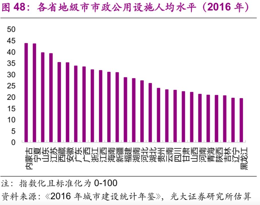 歷史上城市市政公用設施投資增速與總體基礎設施建設投資增速相關(guān)性較高,但近年來(lái)分化加大。而2014年開(kāi)始實(shí)行的規范地方政府債務(wù)的一系列舉措使得當年的城市市政公用設施投資增速轉負,2014、2015年的增速分別為-0.63%、-0.25%,直到2016年才轉正。而城市市政公用設施投資占總體基礎設施建設投資的比例則不斷下降,2016年僅為11.5%,較2003年的高點(diǎn)(32.6%)下降了21個(gè)百分點(diǎn)(圖43)。